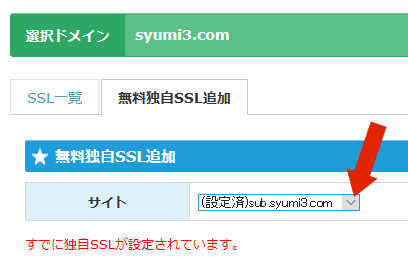 赤い矢印をクリックすると、SSLの追加が出来る登録されているサイトの一覧が表示されるので、設定したいサイト www.syumi3.com を選択し追加設定します。