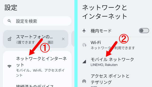 - 「設定」>「①ネットワークとインターネット」>「②モバイルネットワーク」をタップする