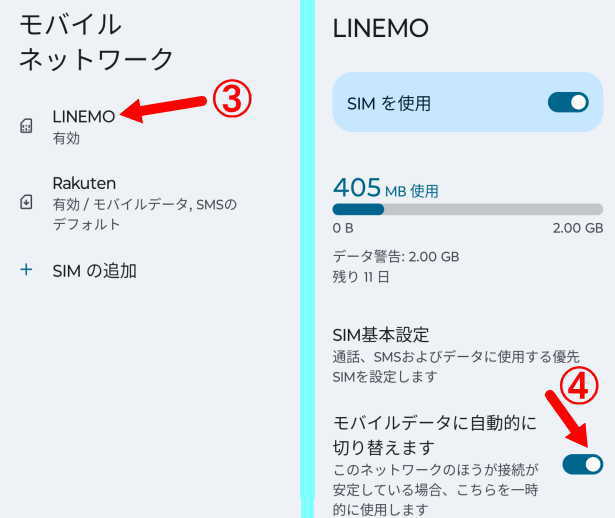 - サブの「③LINEMO」>「④モバイルデータに自動的に切り替えます」をONにする