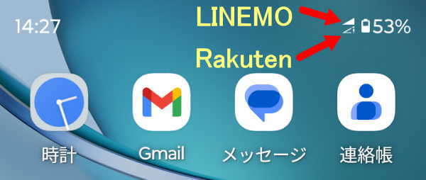 画像の矢印、下がメインの楽天、上が予備のLINEMOです。