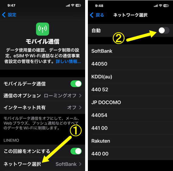 ネットワーク選択画面の矢印②の「自動」をOFFにすると利用可能なキャリア電波の一覧が表示されます