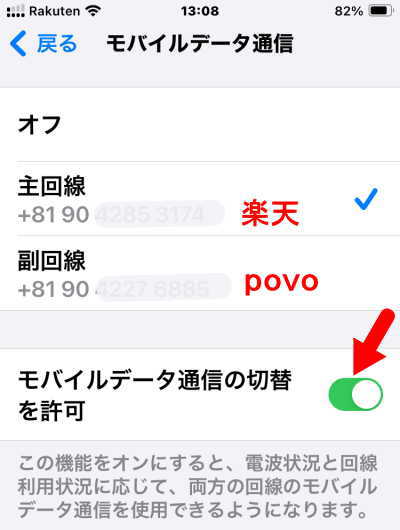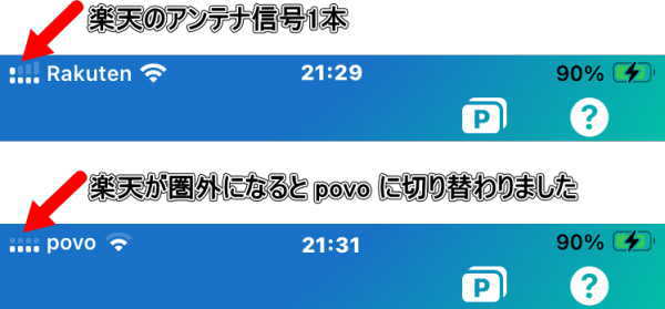 - この設定をしておくと、楽天が圏外になった時、自動的にデータ通信が povo に切り替わりました