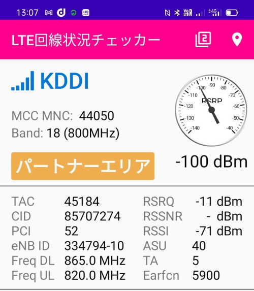 アプリ「Mobile Cell Check」を使用すると、実際に通信しているスマホが、どのBandを掴んで通信しているか確認できます。