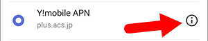 - 自動設定済みの場合は、Y!mobile APN の右側の[i]をタップするか、又は、APN名をタップすると編集画面になります。機種により異なると思われます