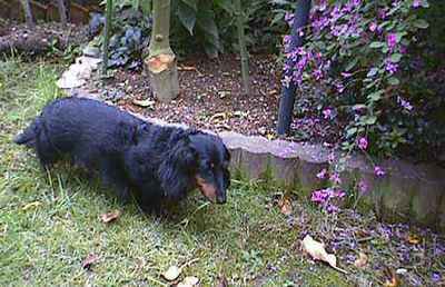 ミニチュアダックス 「ナナ」 雌 (小型犬) 1989年7月4日~2005年7月25日 気が強く見知らぬ人には吼えるが、 散歩の時にはマイペース。 |