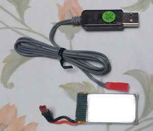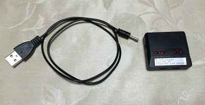 | 標準付属バッテリー 3.7V 380mAh 26x26x7mm(実測したデータ) 所有している予備のバッテリーとは 異なる接続端子が付いています。 SYMA X56W と同じコネクタです。 USB充電器 簡単なUSB充電器が付属しています。 充電を開始すると本体内部のLEDが点灯し、 充電完了すると消灯します。 USB充電器の外観は SYMA X56W と同じです。 |