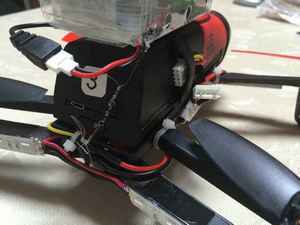 | 右の画像が作成したものを取り付けた様子。 重量が機体の上に加わるのでバランスが心配。 室内でホバリングすると左右へのふらつきが出る。 外で飛ばした時にふらつきがどのくらい出るか、 さらに飛行への影響も少し心配・・・・・・・ 後日確認予定 (2015/05/18現在) |