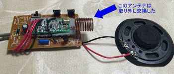 | 基盤の間にスポンジを挟んで2段重ねにし、厚みのあるアンテナを取り外した。 小さなスピーカーの入手はまだなので当面は現在のスピーカーを使用。 重量は、基盤が15g、スピーカーが13g |