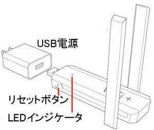 「中継機」をUSB電源に接続し、本体側面の穴に細い棒(ゼムピン や つまようじ 等)を差し込んでカチッと手ごたえがあるまで押し込みそのまま約3~5秒程すると、青と赤のLEDが同時に点灯しますので細い棒を離します。