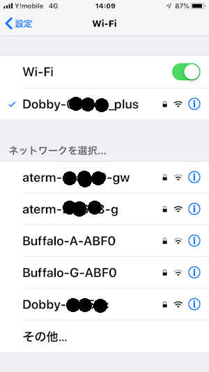 スマホの WiFi設定画面を開くと「Dobby-xxxxxx_plus」のように最後に _plus が付いた SSID が一覧に追加されていますので、これを選択し正常に接続されるか確認をします。