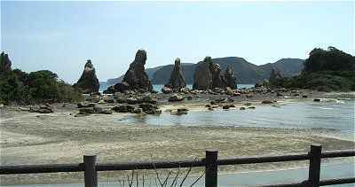 気候も良くなりあちこちのおみやげ屋さんや観光地の駐車場には観光バスがあふれていた。橋杭岩のまわりは干潮で、観光バスが着くたびに海の中の岩の上は人だかりとなる。観光バスが出発した後でパチリ。
