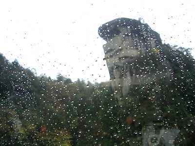 恵那峡 雨の為、観光船の窓に雨粒がつきちょっと見づらい。 しかし、観光船には結構お客さんが乗ってました。 |