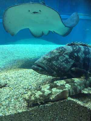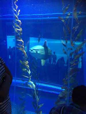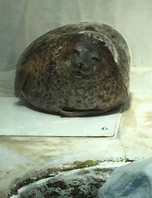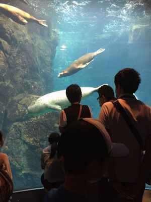 | 愛きょうのある顔をしたアザラシや 中央の大型水槽の周りは 幼稚園児で埋め尽くされていました。 少し隙間が出来た所で 水槽のそばによりパチリ。 |