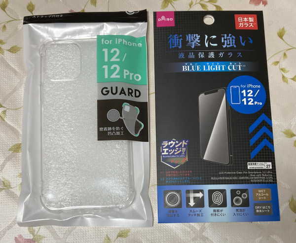 私用のiPhoneは、100円均一のダイソーで「TPUスマホケース」と「ブルーライトカットのガラスフィルム」を買ってきました。