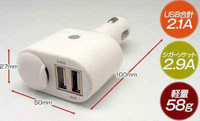 | 1,120円 (税込、送料込) USB2個 + シガーソケット1個 入力電圧・・・12V車専用 左側USB 0.5A 右側USB最大 2.1A iPhone2台同時充電は出来るが、 右側にiPad を接続した時は1台のみ |