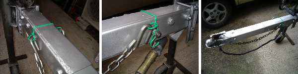 トレーラーのカプラを外した画像が下図であるが、角パイプの下にアングルを溶接してあるためつなぎの板を下面に当てることが出来ず、左右と上面の3面でつなぐことになる。