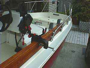 幸いなことに私の船にはステンレス製のしっかりしたバウレールが付いているので、これを利用して木材を取り付け、この木材に竿受けを取り付けることにした。