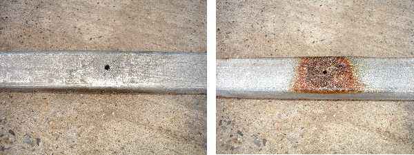 中央上部に小さな穴が開いており、その真下にも穴が開いているがこの部分の錆が一番ひどい。